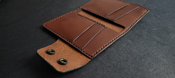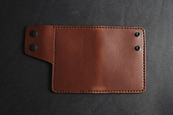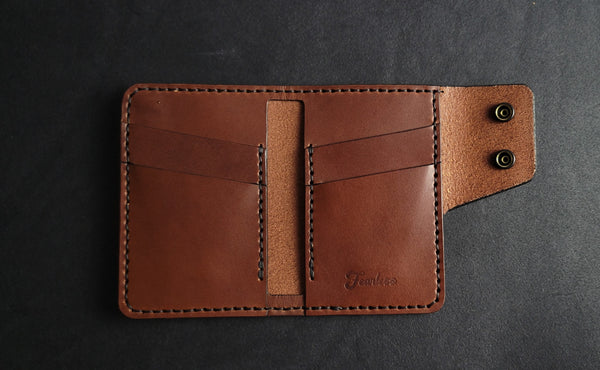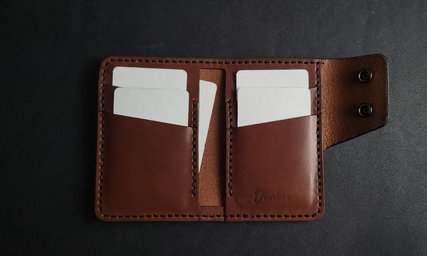 Elevate your style with our 6-pocket vertical wallet. It's compact, yet spacious enough to hold cash and multiple cards. Crafted from full grain leather, it features a secure snap closure and meticulous hand stitching for a unique and elegant finish.