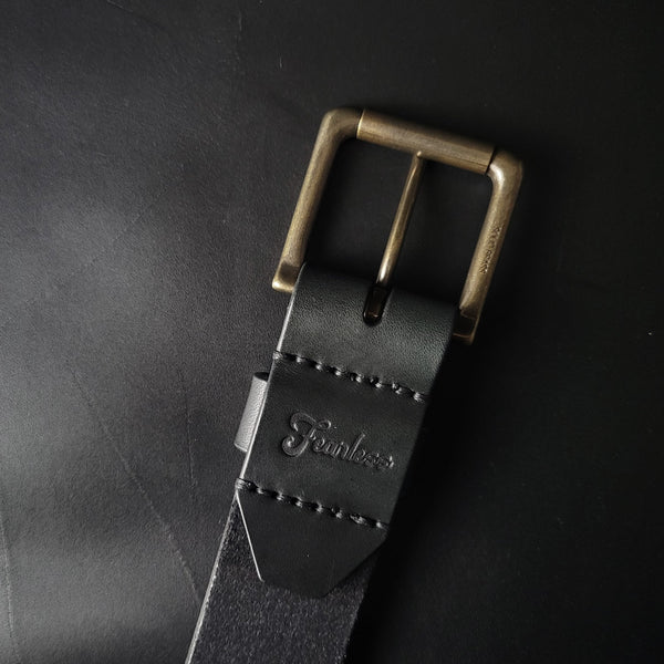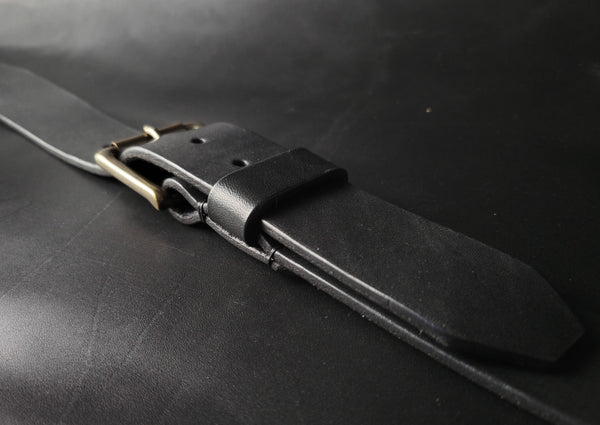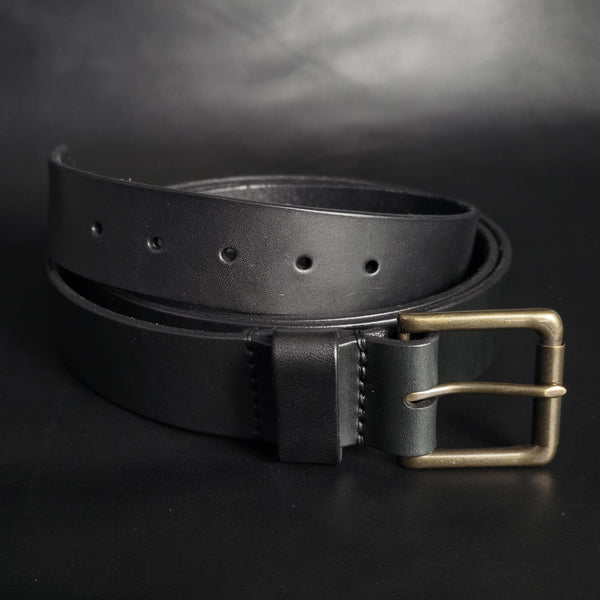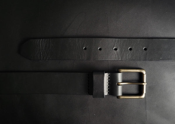 stitched BLACK LEATHER BELT - antique brass buckle